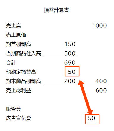 仕入れた商品のうち、50円分を広告宣伝費に使用した場合を見ていきます